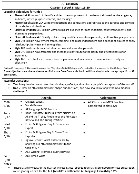 AP Language: In the month of March, students in AP Language will use Ethics and the Ethical implications of Artificial Intelligence as a springboard for test preparation. We’ll first learn several ethical frameworks, from Aristotle to Kant, then apply our learning to a brief research project applying this learning to modern technology. Then, because the ACT is coming up right after Spring Break (April 8th), we’ll be focused on the grammar, reading, and argument writing skills needed to succeed on this exam. This will also help us to build understanding of argumentation more broadly, which will be applicable to the Argument and Synthesis essays on our own AP Language Exam (May 13th).