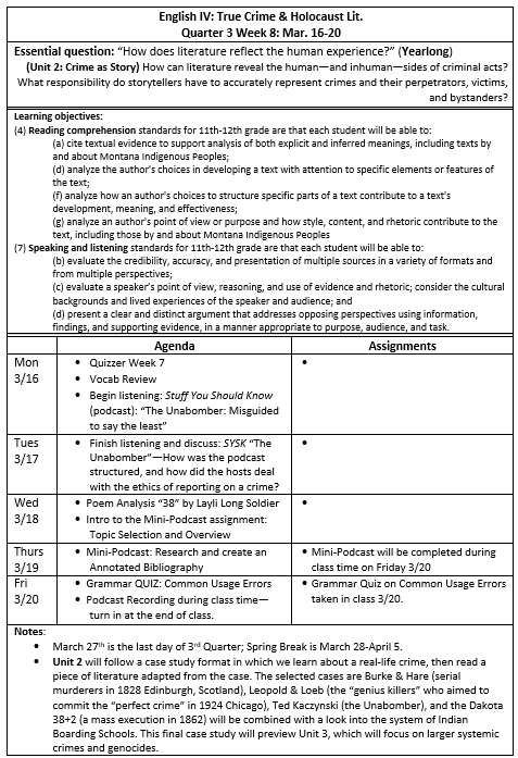 English IV (True Crime & Holocaust): In the last few weeks of Quarter 3, the True Crime class will be working on Unit 2, in which we will follow a case study format to learn about a real-life crime, then read a piece of literature adapted from the case. The selected cases are Burke & Hare (serial murderers in 1828 Edinburgh, Scotland), Leopold & Loeb (the “genius killers” who aimed to commit the “perfect crime” in 1924 Chicago), Ted Kaczynski (the Unabomber), and finally the Dakota 38+2 (a mass execution in 1862), which will be combined with a look into the system of Indian Boarding Schools. This final case study will preview Unit 3, which will focus on larger systemic crimes and genocides. Assessments in Unit 2 will focus primarily on short checks on reading fluency, comprehension, discussion participation, and a summative quiz in the final week.